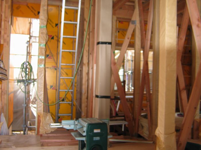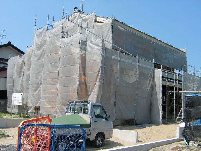 外観はまだ養生シートにかくれていますが、屋根工事とアキレス外断熱工事が完了しました。